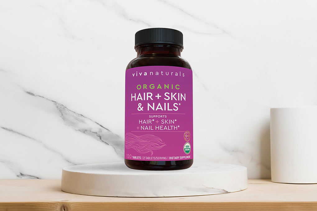 The easiest way to ensure you're getting all these nutrients is through a comprehensive supplement.* Enter our Organic Hair, Skin & Nails* Vitamins – your new self-care superstar. It's designed to support hair, skin, and nail health.*
